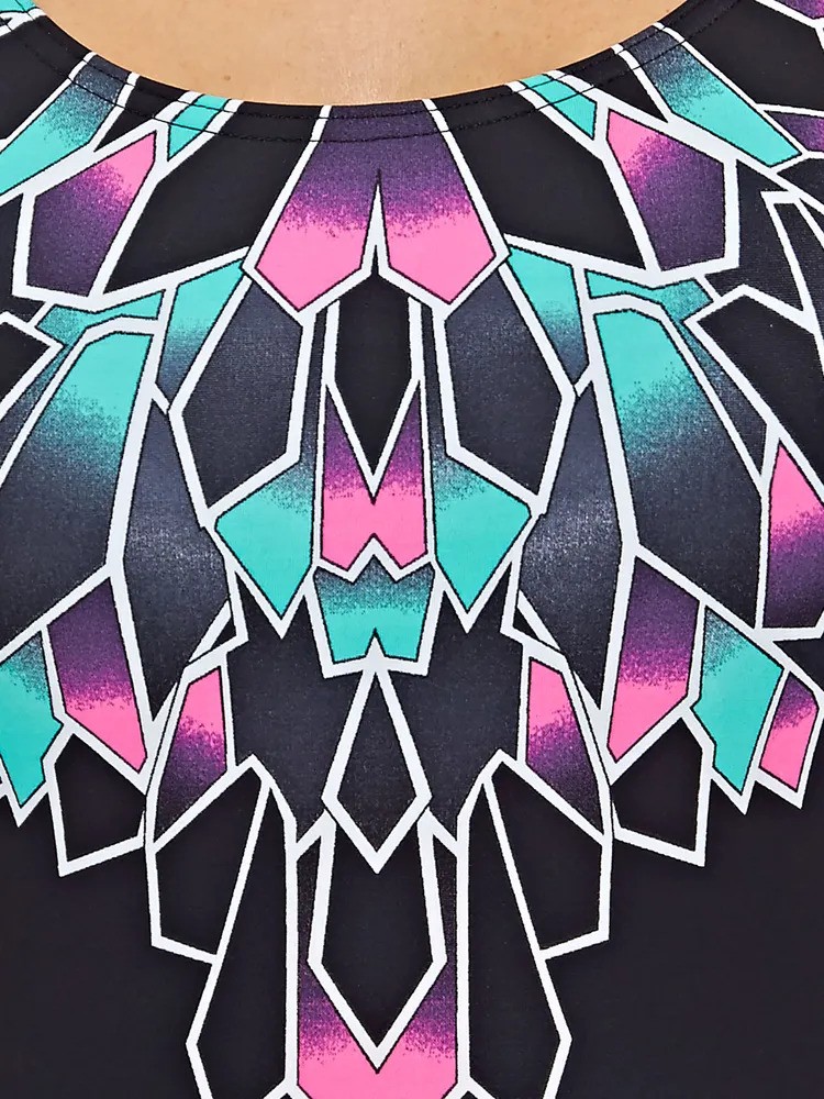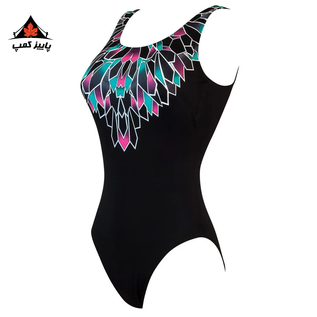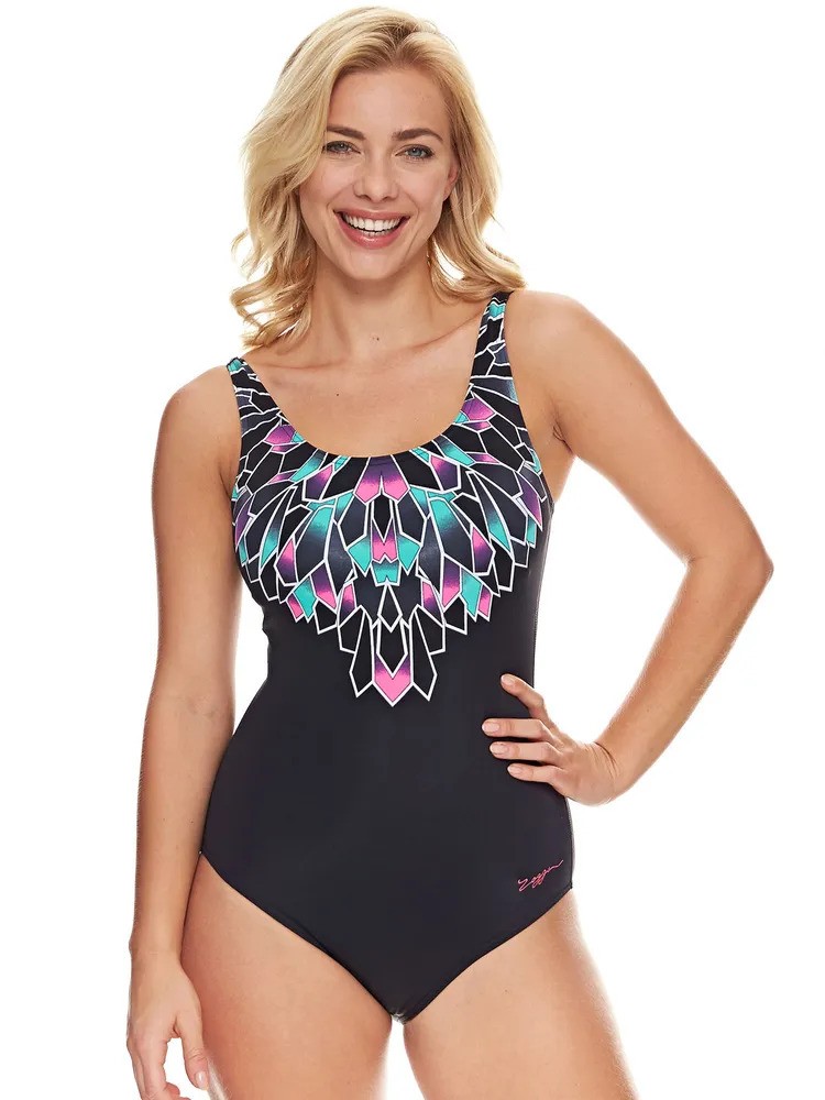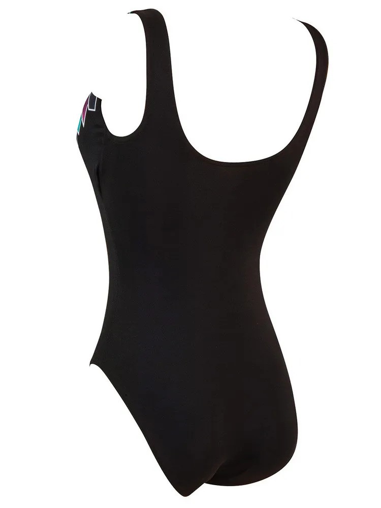 مایو یک تکه زنانه اسکوپ بک کلاس Zoggs Diva مشکی با طرحی هندسی در سایه های مختلف صورتی و سبز دور گردن است. تسمه های مشکی در پشت کنار هم قرار می گیرند تا طرحی کلاسیک را ایجاد کنند. این طرح مایو کلاسیک برای تمرین یا شنای آرام در اطراف استخر عالی است