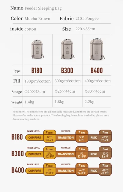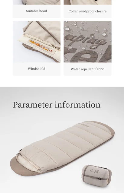 کیسه خواب الیاف نیچرهایک پر شده از پنبه و پوشش نایلون و پارچه اسفجی. این کیسه خواب را می توان با سایر کیسه خواب های هم نوع ترکیب کرد تا تبدیل به یک کیسه خواب دو نفره شود.بسیار سبک می باشد.