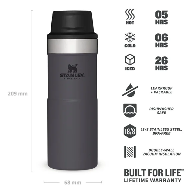 لیوان حرارتی STANLEY - طراحی جدید، گرفتن بهتر، ویژگی های کلیدی یکسان، عملکردهای منحصر به فرد، کلاسیک برای سال ها استفاده.لیوان ترمو که با یک دست کار می کنید. فشردن - می نوشید، فشار نمی دهید، جریان نمی یابد. 100% آب بندی و دمای مورد نیاز را حفظ می کند. لازم نیست بایستد، می تواند دراز بکشد و باز هم نشت نکند. درپوش قابل جدا شدن برای تمیز کردن آسان. متناسب با اکثر پایه های ماشین. محتوای آن حتی دوستداران قهوه کوچکتر را راضی خواهد کرد. شکل باریک، می توانید آن را در کیف یا کوله خود بیندازید و به خوبی در یک کف دست کوچک جا می شود.